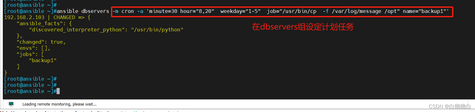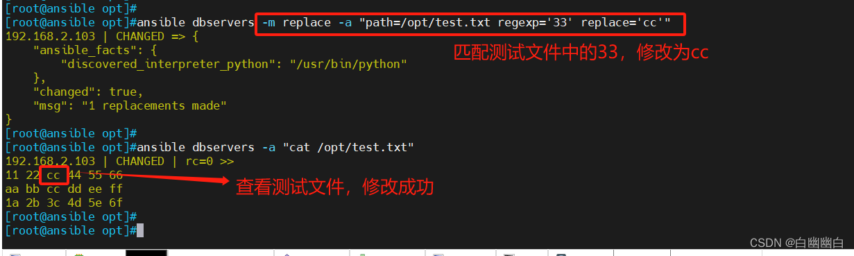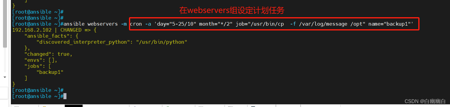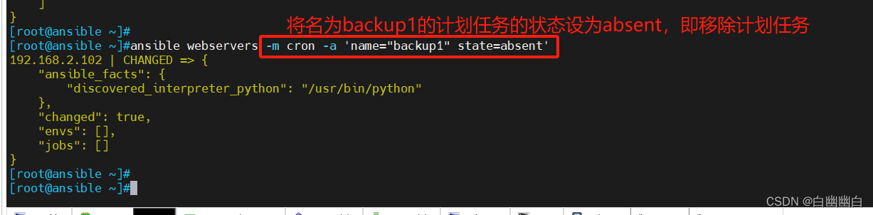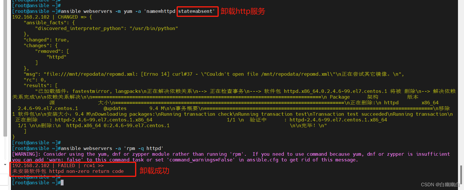 模块(Modules): 模块是 Ansible 的基本执行单元,用于执行具体的任务。Ansible 提供了丰富的内置模块,例如 yum、apt、service 等。