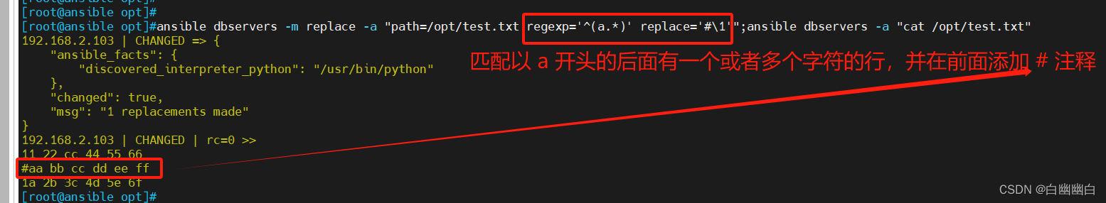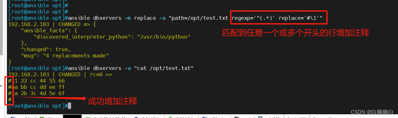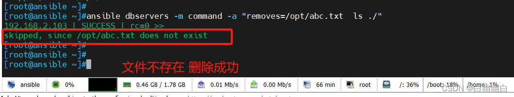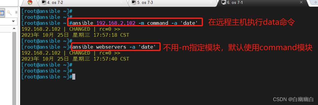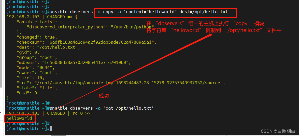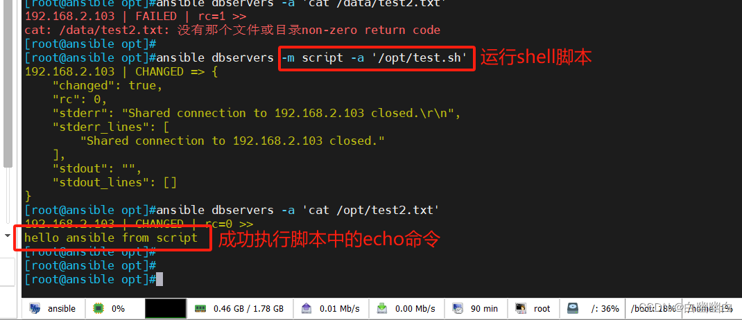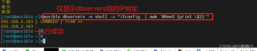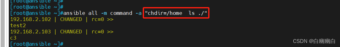 ad-hoc模式(点对点模式) 使用单个模块,支持批量执行单条命令。ad-hoc 命令是一种可以快速输入的命令,而且不需要保存起来的命令。就相当于bash中的一句话shell。