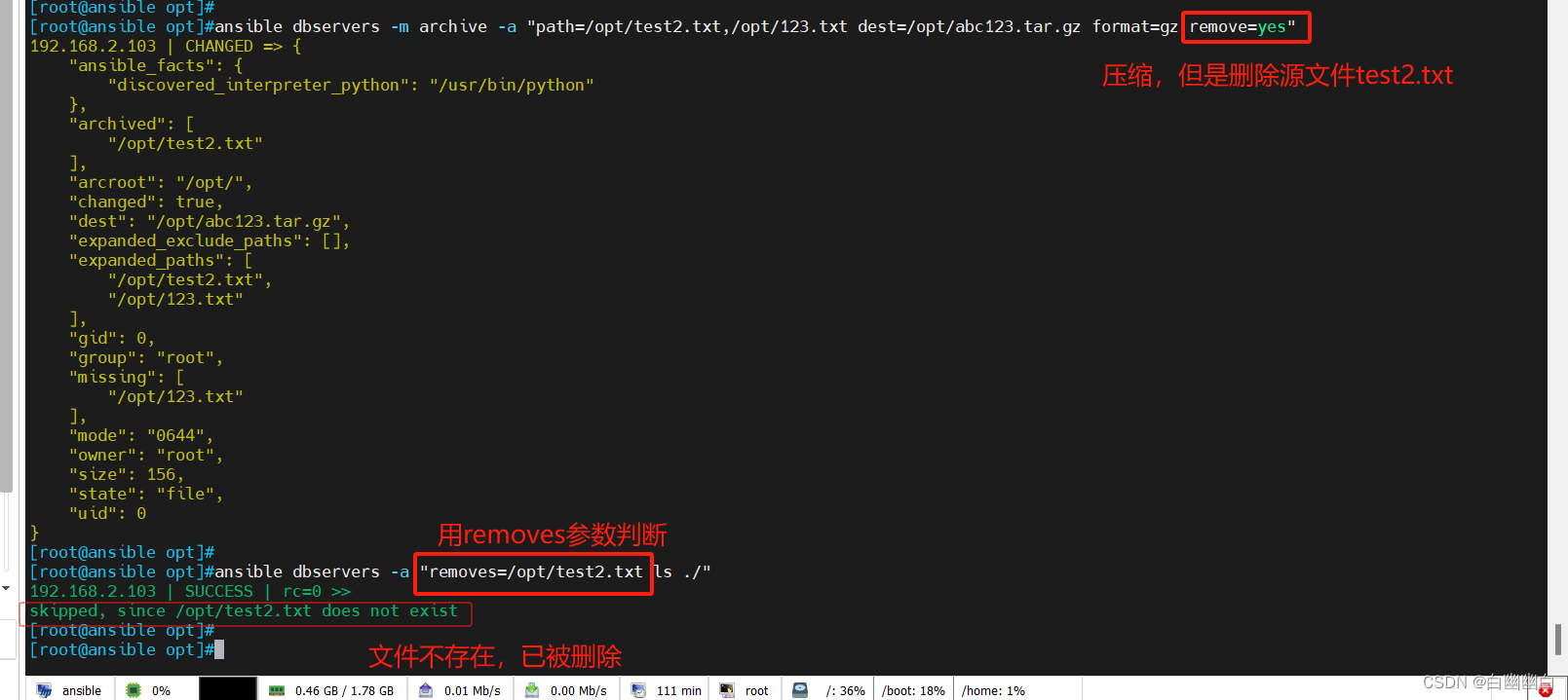 dest: 指定将文件下载的绝对路径—必须 url: 文件的下载地址(网址)—必须 url_username: 用于http基本认证的用户名 url_password: 用于http基本认证的密码 validate_certs: 如果否,SSL证书将不会验证。这只应在使用自签名证书的个人控制站点上使用 owner: 指定属主 group: 指定属组 mode: 指定权限