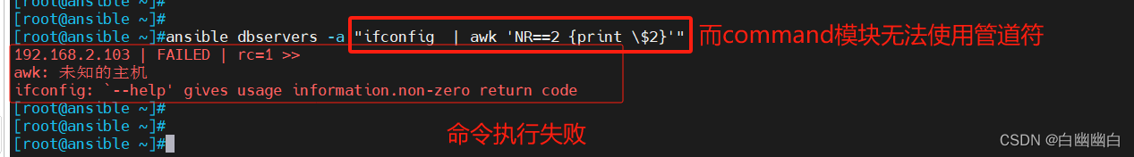command、shell、script、yum、copy、File、async、docker、cron、mysql_user、ping、sysctl、user、acl、add_host、easy_install、haproxy_等。command 不支持管道符,可以使用shell模块