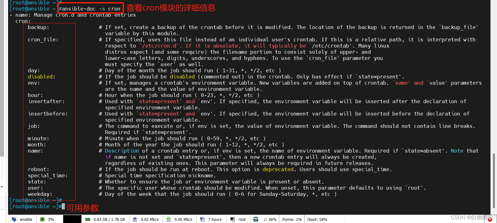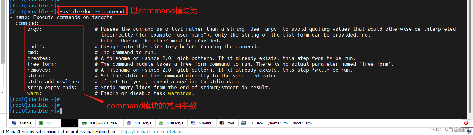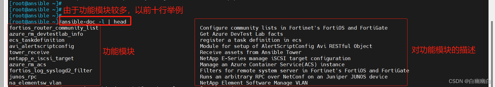 ansible-doc -l more查看ansible支持的模块,也可以查看每个模块的帮助文档,ansible-doc module name