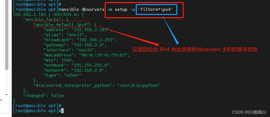 ansible -i /etc/ansible/hosts all/或者组名/单个主机IP -m 模块名称 -a '参数'#查看当前系统中的ansible模块