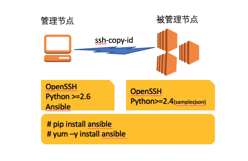被管理节点 确保存在OpenSSH 确保Python 版本 >= 2.4 //若为2.4 版本,确保安装了python-samplesjson 扩展 不需要安装ansible