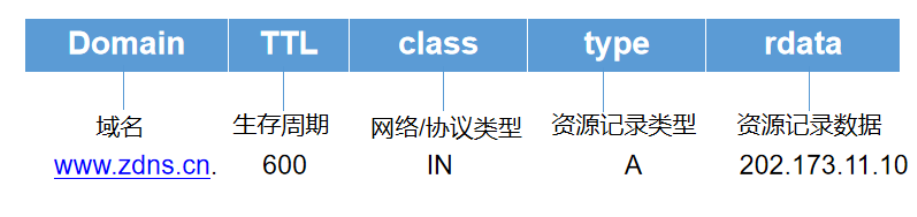 记录一条域名信息映射关系,称之为资源记录(RR)。当我们查询域名www.zdns.cn的时候,查询结果得到的资源记录结构体中有如下数据: