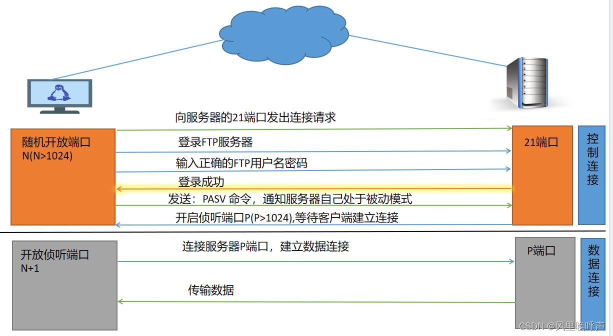 第一步:客户端的命令端口N主动连接服务器命令端口21,并发送PASV命令,告诉服务器用“被动模式”,控制连接建立成功后,服务器开启一个数据端口P,通过PORT命令将P端口告诉客户端