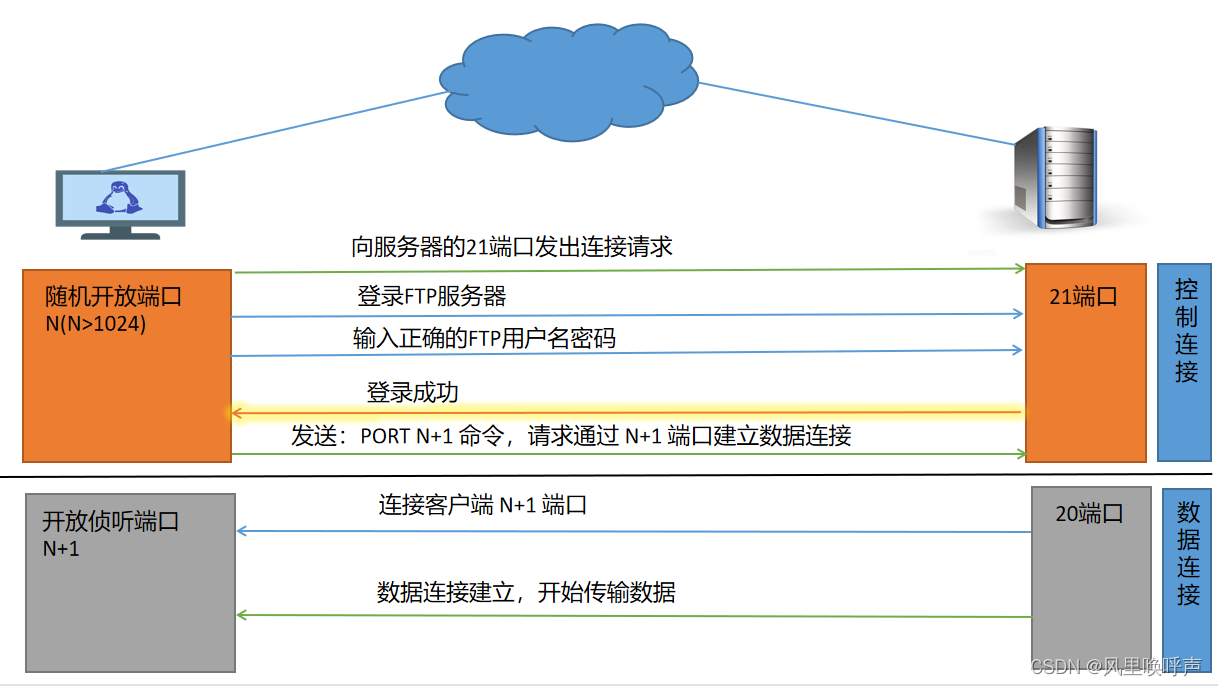 第一步:客户端使用端口N连接FTP服务器的命令端口21,建立控制连接并告诉服务器我这边开启了数据端口N+1