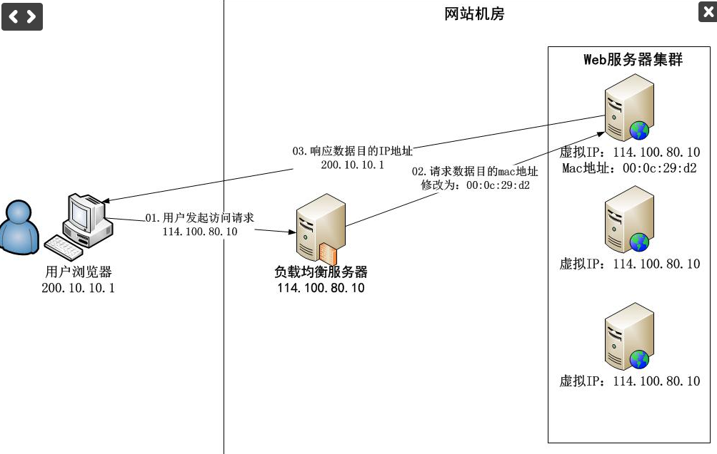 当用户发起请求时,源地址是客户端IP,目标地址是VIP;而LVS调度器将请求转发给Real Server处理后再发送给用户,这个时候源IP是RIP,目标地址是客户端IP,但是客户端一开始并没有请求RIP,而用RIP去响应请求时CIP是不会接受的,所以就需要用VIP响应请求。在DR模式下LVS和Real server都需要配备一样的VIP(VIP的MAC地址和物理网卡是一样的)(Real Server通过将VIP绑定在loopback实现)。由于一个网段内多台服务器出现同样IP地址会引起冲突,所以要在LVS服务器上设置一个VIP一个DIP,而每个Real Server也有一个RIP和一个VIP,并且将Real Server的VIP地址做了隐藏和ARP抑制,不会应答广播,只在响应CIP时作为源地址使用。当产生请求时LVS将目标MAC地址修改为某台Real Server的MAC,该包就会被转发到相应的Real Server处理,此时源IP和目标IP都没变。Real Server收到LVS转发来的包时发现MAC是自己的,IP也是自己的,于是这个包被合法地接受。当Real Server返回响应时,只要直接向CIP返回即可,不再经过LVS。
