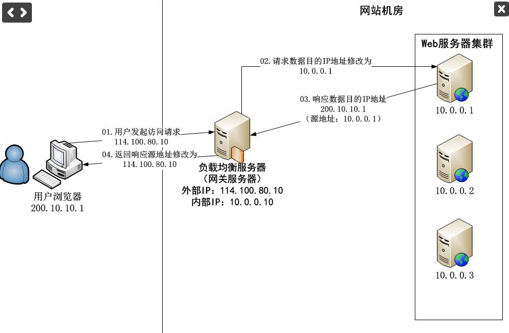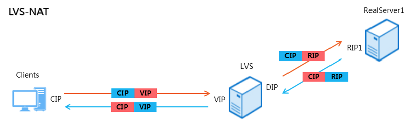 NAT(Network Address Translation)是一种外网和内网地址映射的技术。每台Real Server的网关将是LVS服务器的地址,用户请求的数据进出都要经过LVS(所以它容易成为瓶颈)。当LVS服务器收到用户请求时会进行目标地址转换(DNAT),将请求IP修改为后端Real Server的IP,此时客户端IP不变,目标IP是VIP。Real Server响应用户请求时,需要再让LVS做源地址转换(SNAT),将返回的数据包源地址改为VIP。此时目标IP是客户端IP,而源IP是VIP,可以正常响应客户端请求。而对客户端来说仿佛是LVS进行的响应,无法感知到后端Real Server的存在。