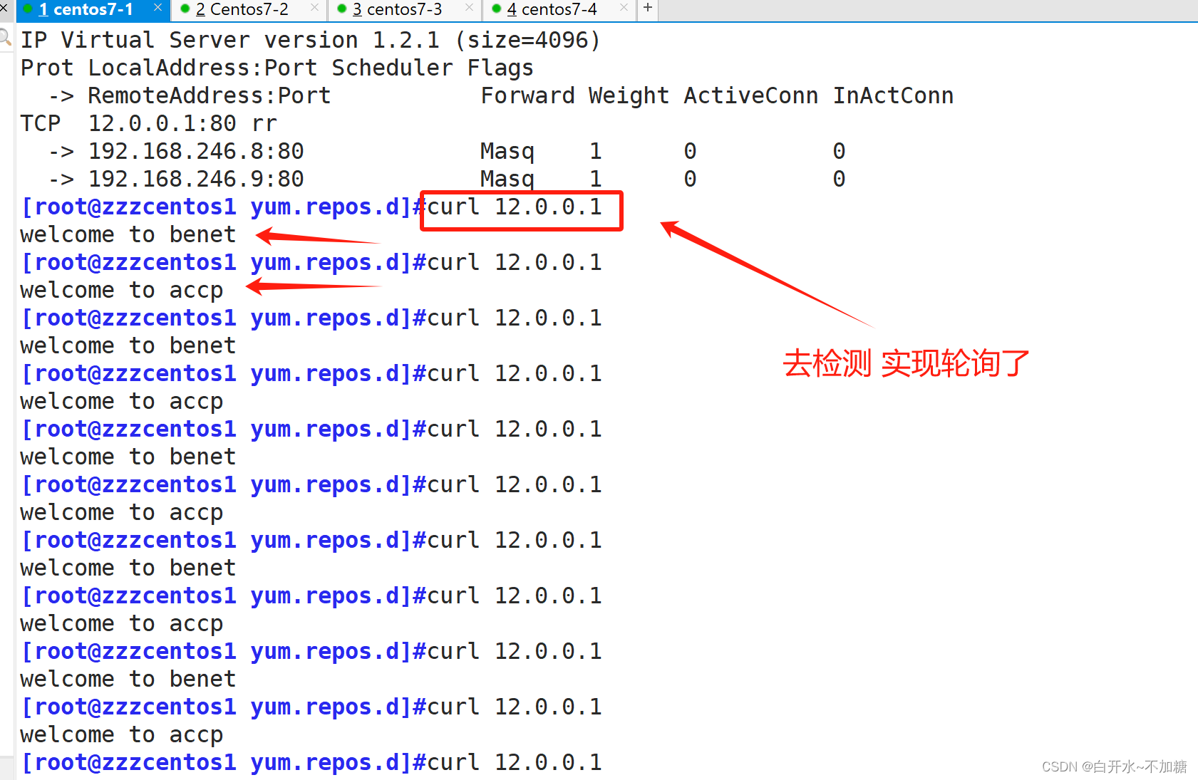 轮询调度(Round Robin 简称’RR’)算法就是按依次循环的方式将请求调度到不同的服务器上,该算法最大的特点就是实现简单。轮询算法假设所有的服务器处理请求的能力都一样的,调度器会将所有的请求平均分配给每个真实服务器。