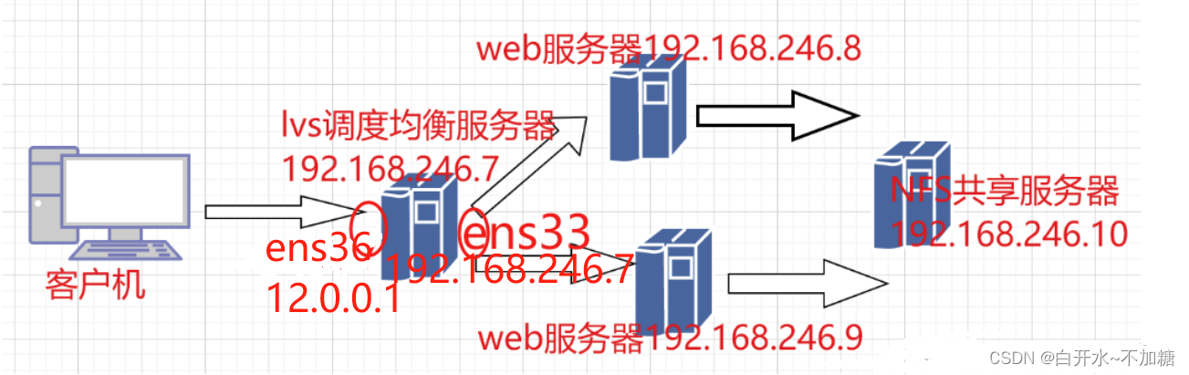 NAT模式的集群节点需要跟director在同一网络;RIP通常是私有地址,仅用于各集群节点间的通信;RealServer的网关应该指向DIP;支持端口映射(转发);用户发起的请求由调度器向Real Server提交,Real Server再把数据经过调度器传给用户。相比DR模式的话,这样安全性高,但是效率低,瓶颈会出现在调度器上,生产环境几乎不用。