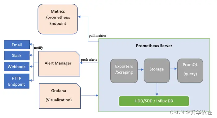 同时Prometheus后端用 golang语言开发,前端是 Grafana
