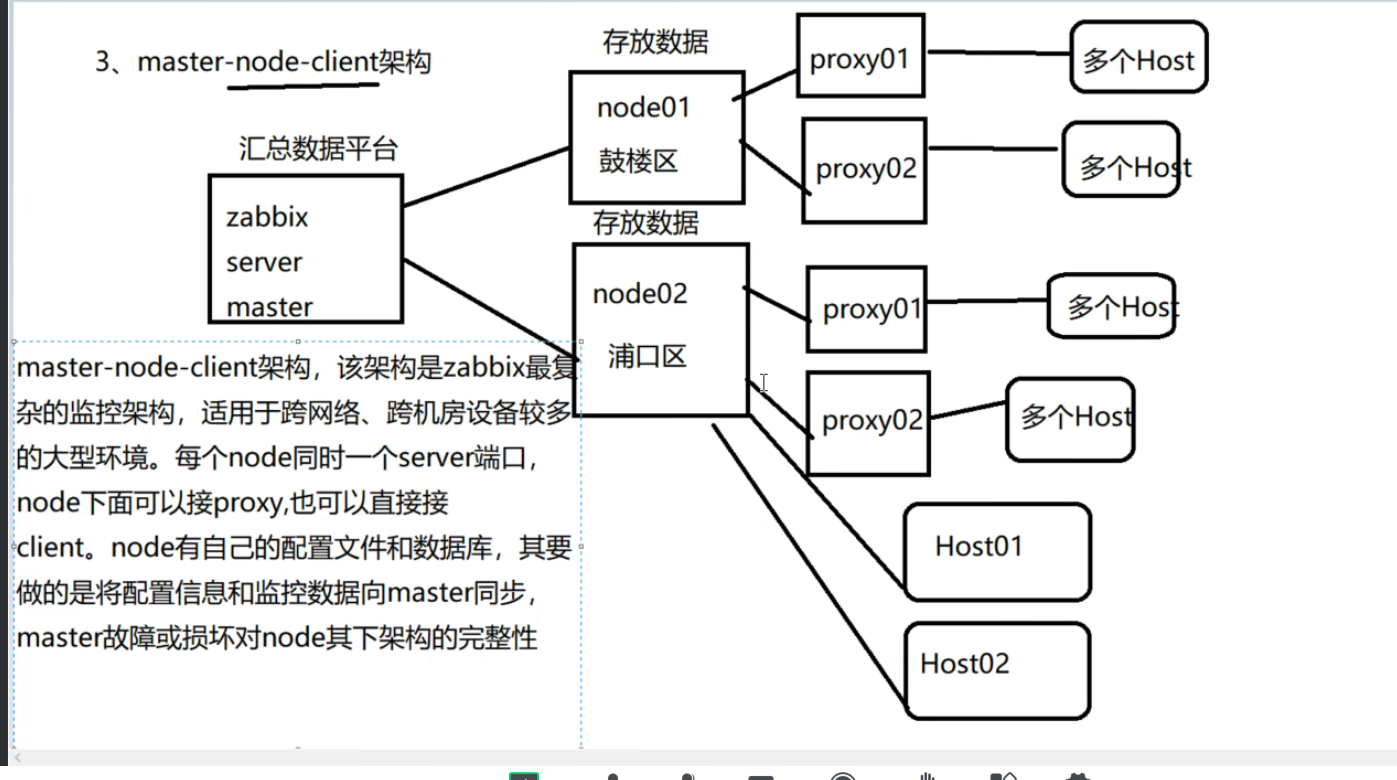 该架构经常是和master-node-client架构做比较的架构 ,一般适用于跨机房、跨网络的中型网络架构的监控