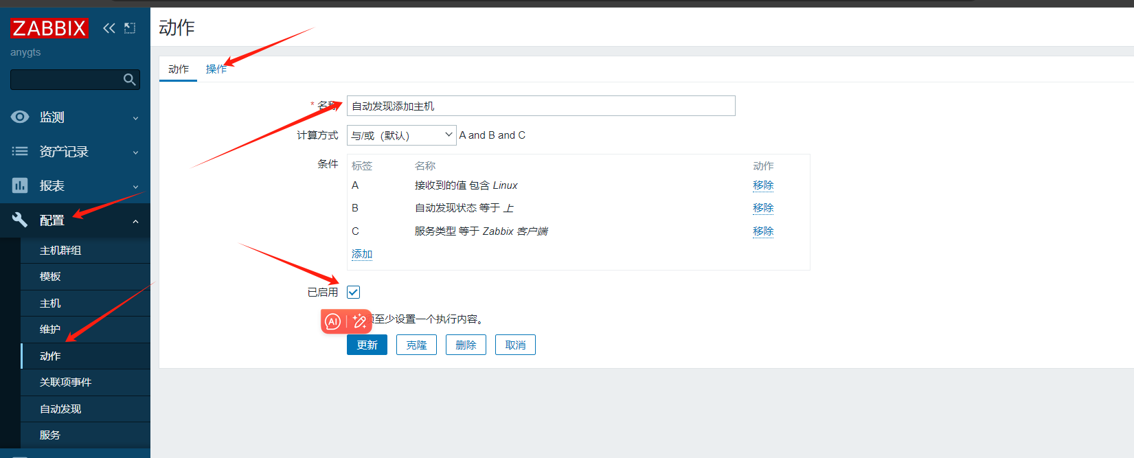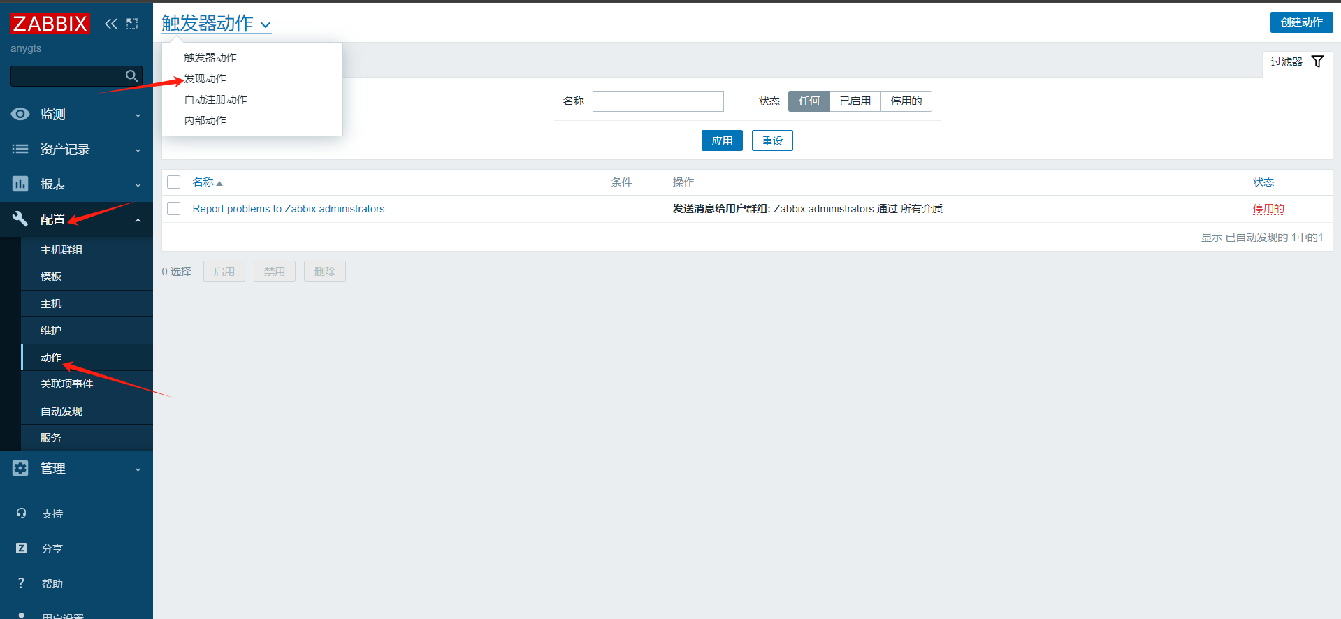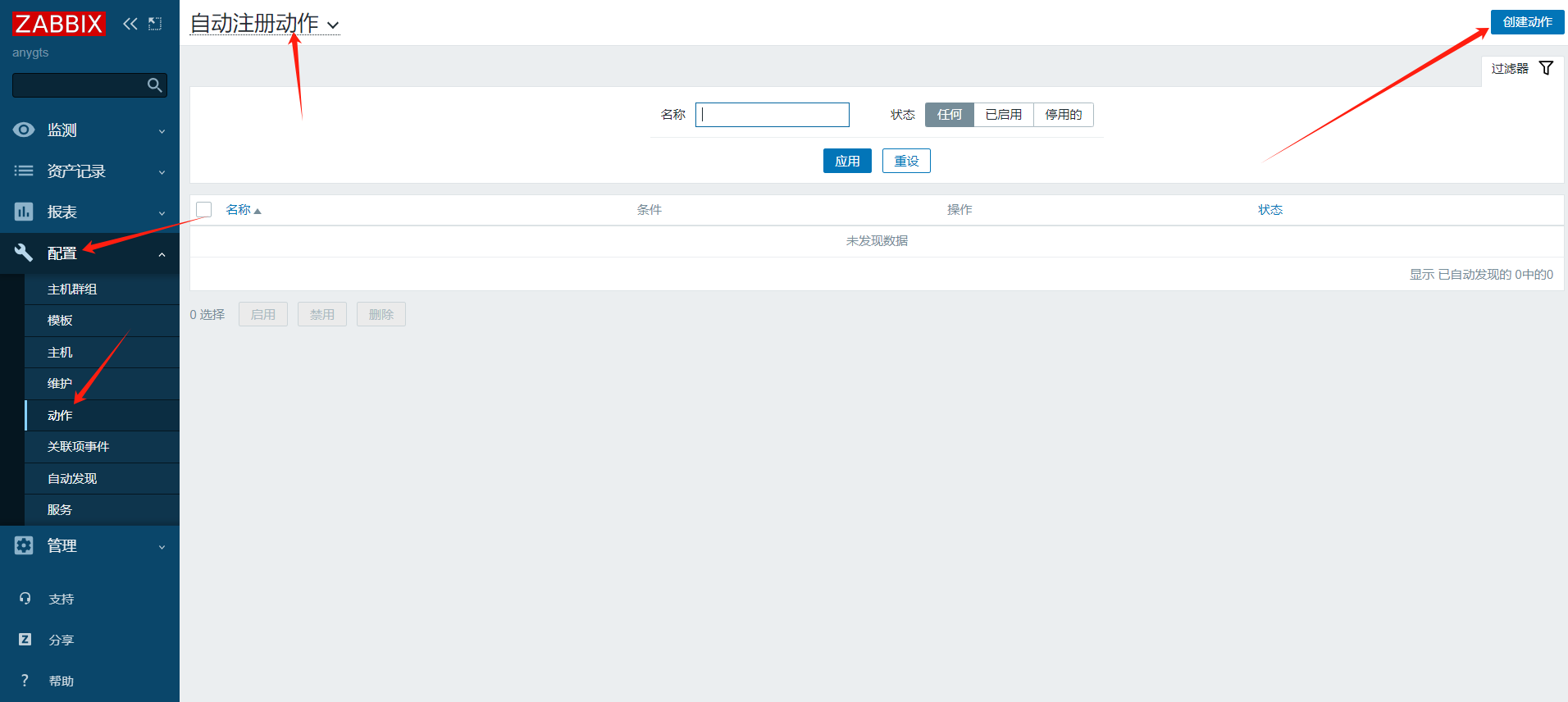 点击左边菜单栏【配置】中的【动作】,勾选自动注册规则,点击 禁用