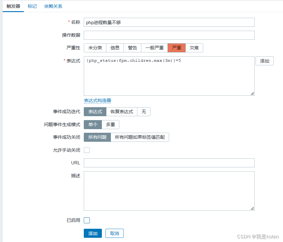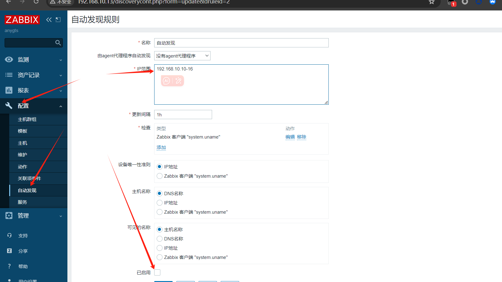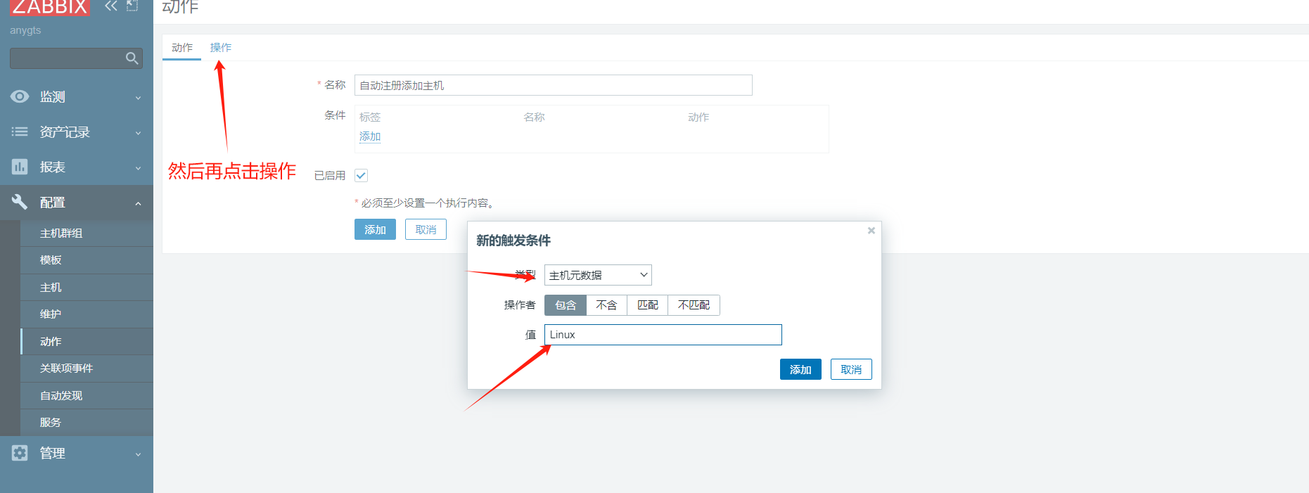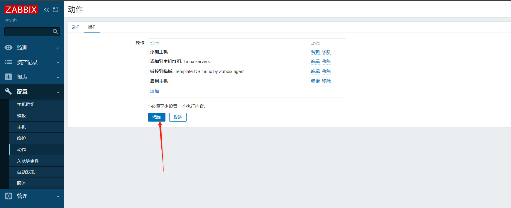 点击左边菜单栏【配置】中的【动作】,勾选自动注册规则,点击 禁用