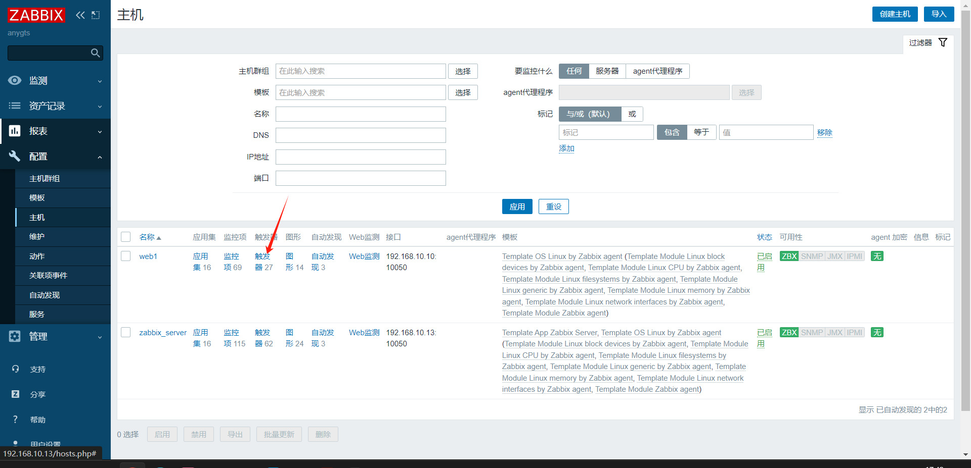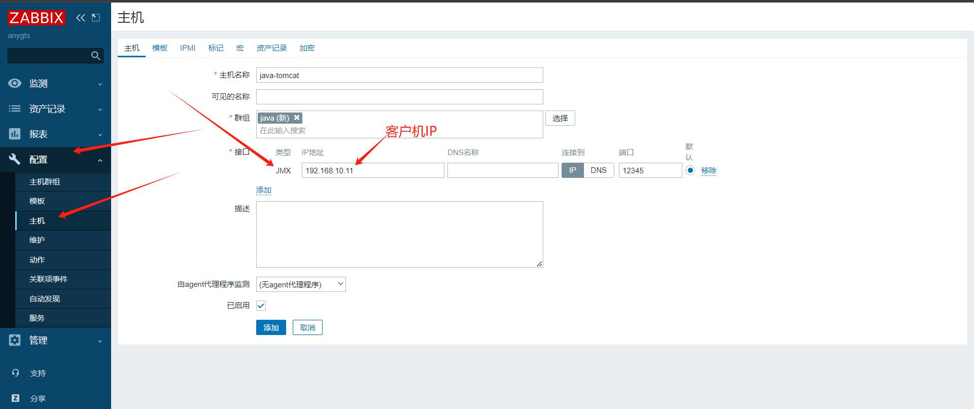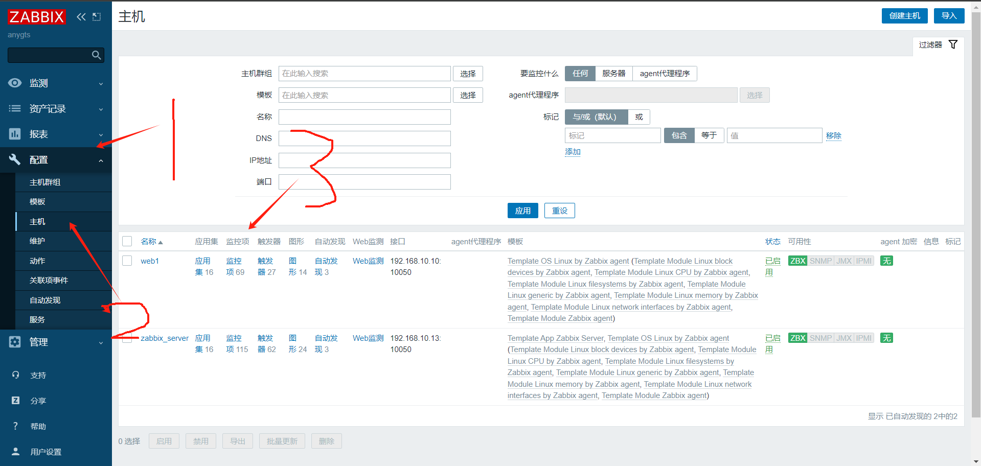 点击左边菜单栏【配置】中的【主机】,勾选原有的客户端主机,点击 删除