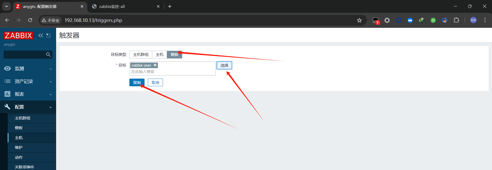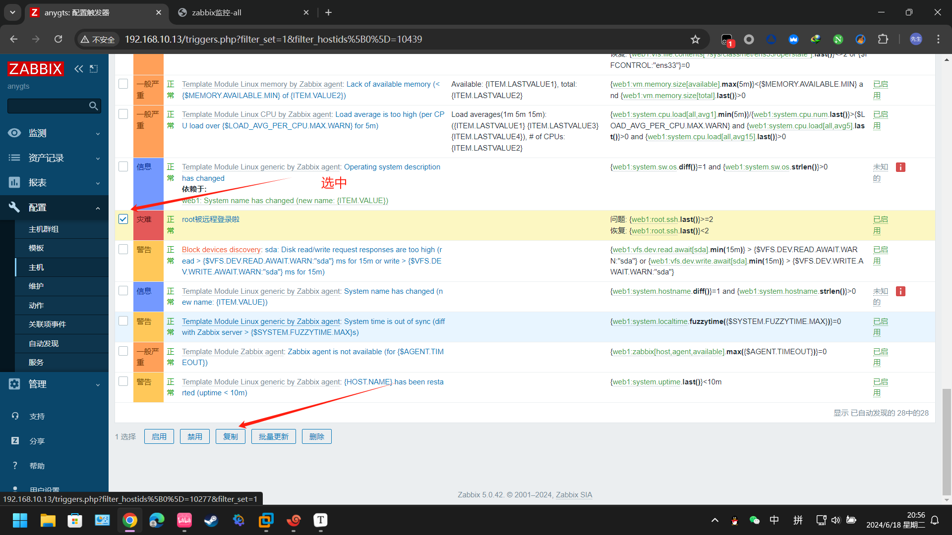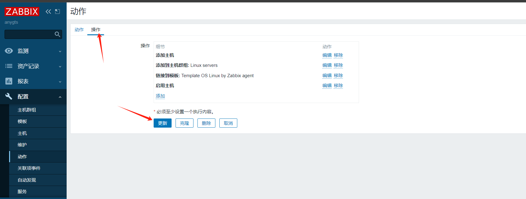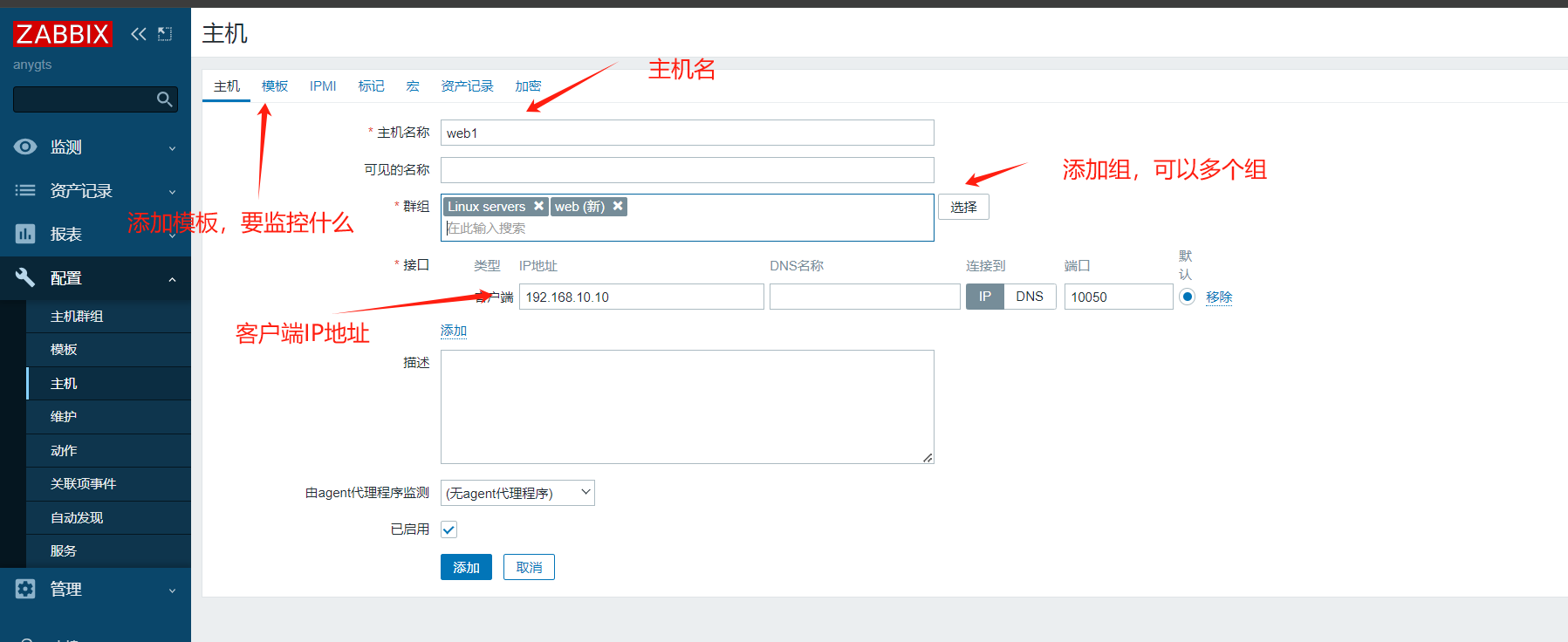 点击左边菜单栏【配置】中的【主机】,勾选原有的客户端主机,点击 删除