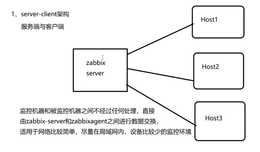 监控机和被监控机之间不经过任何代理 ,直接由zabbix server和zabbix agentd之间进行数据交互