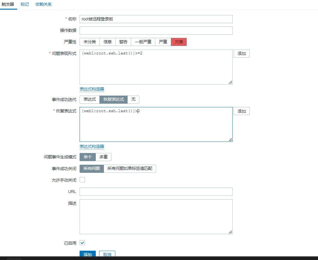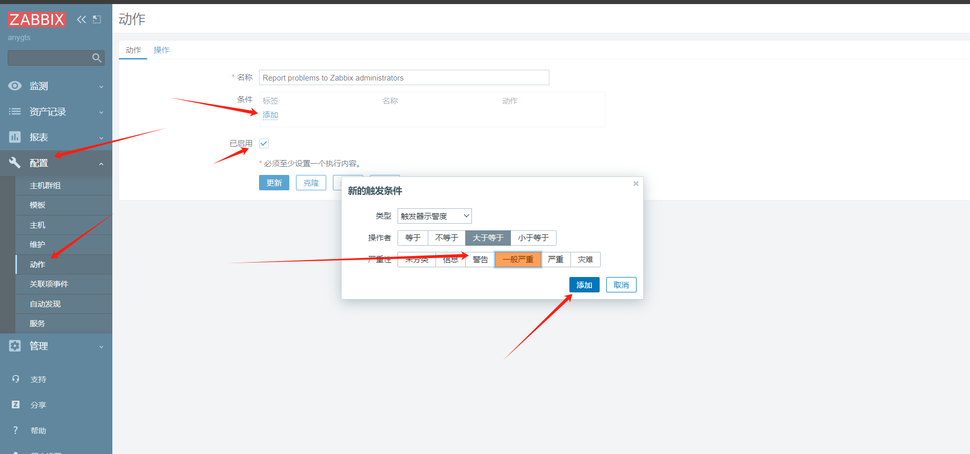 当zabbix监控某个具体的项目, 该项目会设置一个触发器阈值,当被监控的指标超过该触发器设定的阈值,会进行一些必要的动作,包括发送信息(邮件、微信、短信)、发送命令(shell 命令、reboot、restart、install 等)