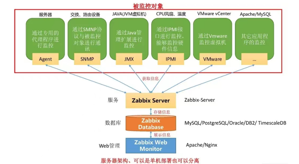 Zabbix web:GUI图形化界面,zabbix的web界面,管理可以通过zabbix的web界面管理zabbix配置以及查看zabbix的监控信息,可以独一部署在一台服务器上
